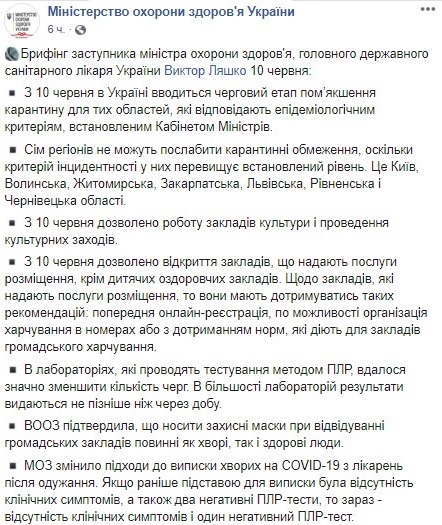 "С 10 июня в Украине вводится очередной этап смягчения карантина для тех областей, которые соответствуют эпидемиологическим критериям, установленным Кабинетом Министров. Семь регионов не могут ослабить карантин, поскольку критерий инцидентности в них превышает установленный уровень. Это Киев, Волынская, Житомирская, Закарпатская, Львовская, Ровенская и Черновицкая области", - указано в сообщении.