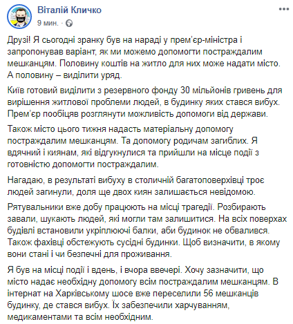 "Я сегодня утром был на совещании у премьер-министра и предложил вариант, как мы можем помочь пострадавшим жителям. Половину средств на жилье для них может предоставить город. А половину - выделить правительство. Киев готов выделить из резервного фонда 30 миллионов гривен для решения жилищной проблемы людей, в доме которых произошел взрыв. Премьер пообещал рассмотреть возможность помощи от государства", - сообщил Кличко.