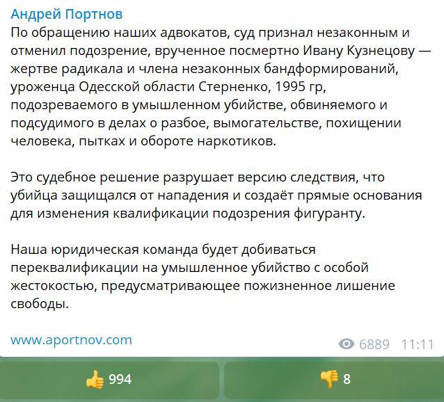 "Это судебное решение разрушает версию следствия, что убийца (Стерненко - Ред.) защищался от нападения и создает прямые основания для изменения квалификации подозрения фигуранту", - написал Андрей Портнов в своем телеграм-канале во вторник, 23 июня.