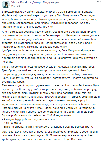 Так, Виктор Дацко из Ивано-Франковской области поделился фото с дороги Ильци – Буркут, которую размыло фактически и уничтожило берегоукрытие, где было заблокировано 40 автомобилей с туристами, а один автомобиль упал в воду (водитель и пассажир погибли, а поток унес одну женщину).