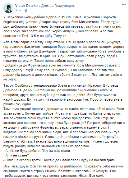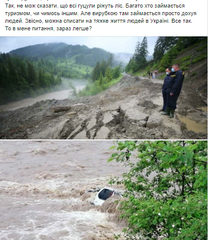 "Каждый второй/третий раз как я туда приезжал, то видел опер группу, описывающую левый кругляк. Я уже молчу о десятках ЗИЛов и фур, которые каждый день вывозят тонны леса. И какая была реакция? Угрозы, обещания я не доеду в свой сраный Франковск, сейчас сбросим машину в реку. И бросались не только специальные люди, но и рядовые местные" - написал он. При этом добавил, что нельзя сказать, что все гуцулы режут лес. Многие занимаются туризмом, или чем-то другим, но вырубкой занимаются очень много людей.