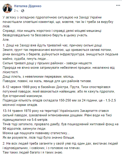 Сильные продолжительные дожди в горных районах - всегда несчастье. Природа не вечно может задерживать опасные процессы, независимо от лесистости. Дожди льют, с небольшими перерывами, месяц. Паводки, наводнения, к сожалению, явление для этих районов типичное" - написала она и привела в пример паводки 1969 года, 1970 года, когда в Тячеве прорвало дамбу и погибли люди.