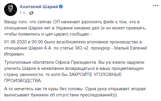 "Ввиду того, что сейчас ОП начинает разгонять фейк о том, что в отношение Шария нет в Украине никаких дел (и он может приехать, чтобы появились и цап-царап) сообщаю - 01.06.2020 в 00:00 было возобновлено уголовное производство в отношение Шария А.А. по статье 383 ч2. прокурор - Малый Евгений Игоревич", написал Анатолий.