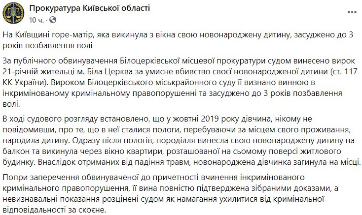 "В Киевской области горе-мать, которая выбросила из окна своего новорожденного ребенка, приговорена к 3 годам лишения свободы. Вынесен приговор 21-летней жительнице г. Белая Церковь за умышленное убийство своего новорожденного ребенка", - указано в сообщении.