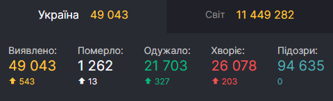 По данным на утро понедельника, 6 июля, в Украине зарегистрировано уже 49 043 случая заражения Covid-19. Вчера, 5 июля в нашей стране было отмечено 48 500 случаев. Таким образом, прирост новых зараженных за сутки составил 543 человека. Умерло с начала эпидемии 1 262 человека (+ за сутки 13 человек), выздоровели в общей сложности 21 703 украинца (+327 за сутки).