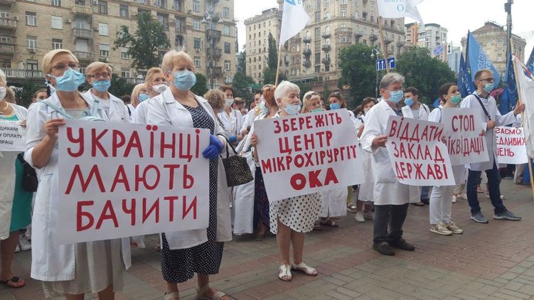 Сегодня, 7 июля, в 10:00 врачи киевского Центра микрохирургии глаза вышли на акцию протеста под Киевскую городскую государственную администрацию (КГГА) за сохранение уникальных медицинских учреждений. По словам участников акции, их центр - это последнее учреждение в Украине, где спасают детям зрение. Но из-за отсутствия финансирования медцентр может закрыться.