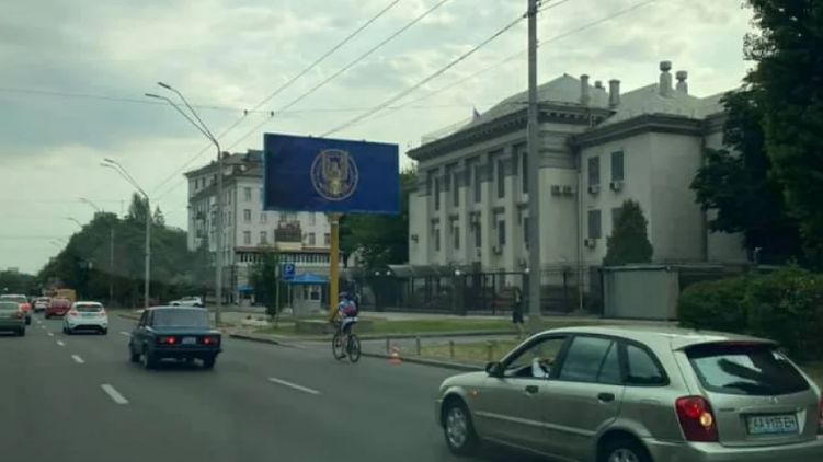 Билборд возле посольства РФ в Киеве называют незаконно установленным. Фото:Facebook/ Ігор Маріо