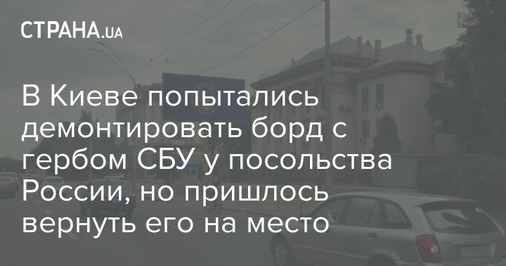 В ночь с 6 на 7 июля в Киеве коммунальщики попытались демонтировать билборд с гербом контрразведки СБУ у посольства РФ в Киеве. Рекламу сняли, но потом вернули. Впрочем, в КГГА обещают снова демонтировать щит.
