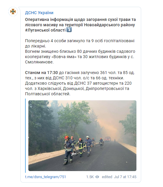 "РГА Новоайдарского района приготовила помещение для эвакуации жителей поселков, находящихся в эпицентре лесного пожара. Я и сотрудники представительства Офис Омбудсмана Украины в Луганской и Донецкой областях находятся на круглосуточном связи.