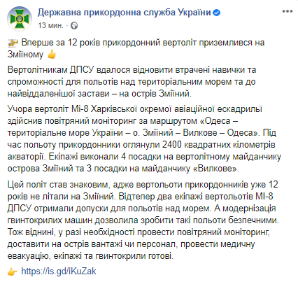 Возобновить полеты спустя 12 лет удалось потому, то два экипажа вертолетов МИ-8 Госпогранслужбы Украины получили допуски для полетов над морем.