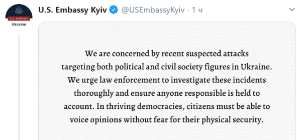 "Мы обеспокоены недавними подозрительными нападениями, направленными как против политических деятелей, так и представителей гражданского общества. Призываем правоохранительные органы тщательно расследовать эти случаи и обеспечить привлечение к ответственности всех причастных. В благополучном демократическом обществе граждане должны иметь возможность высказывать мнение, не опасаясь за свою физическую безопасность", - говорится в заявлении посольства в Twitter.