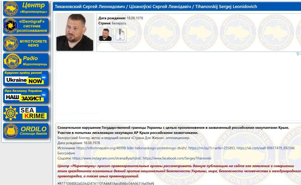 В "Миротворце" обосновали свое решение поместить блогера в базу данных тем, что Тихановский пошел на "сознательное нарушение Государственной границы Украины с целью проникновения в захваченный российскими оккупантами Крым; участие в попытках легализации оккупации АР Крым российскими захватчиками". По информации активистов, в 2018 году беларуский активист посетил Крым.
