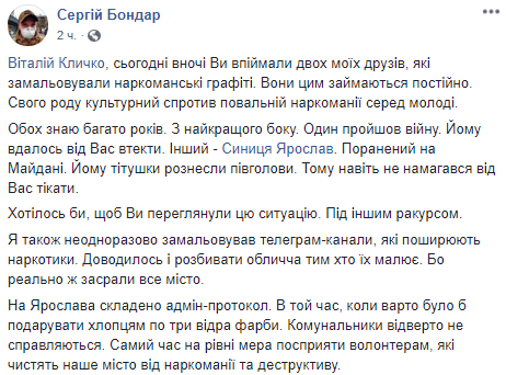"Виталий Кличко, сегодня ночью Вы поймали двух моих друзей, которые зарисовывали наркоманские граффити. Они этим занимаются постоянно. Своего рода культурное сопротивление повальной наркомании среди молодежи.