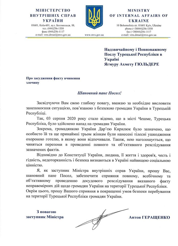 4 августа замминистра МВД Антон Геращенко сообщил, что встретился с заместителем посла Турции в Украине после избиения украинки.