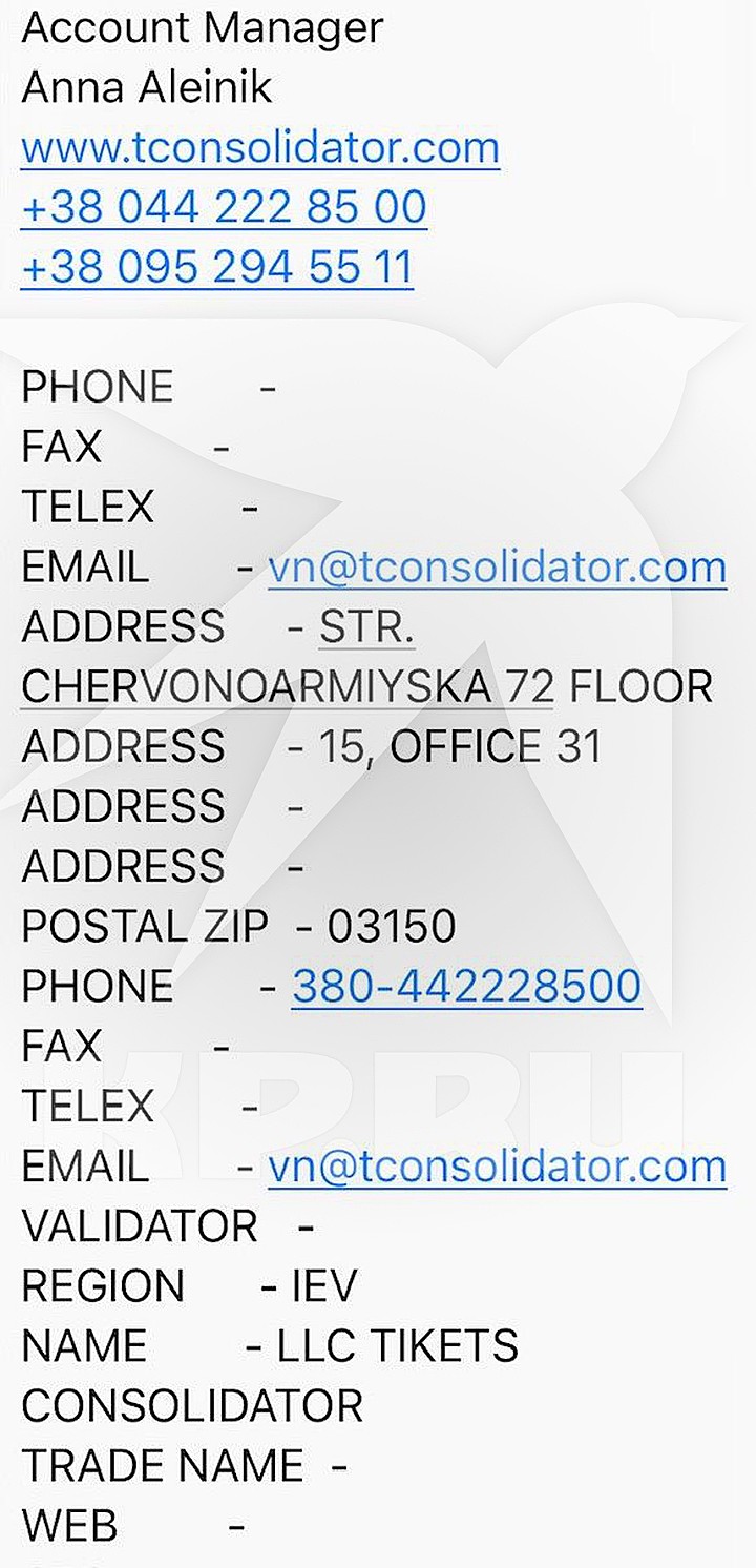 При этом в качестве консолидатора данной группы билетов в системе бронирования указана Анна Алейник, телефоны украинские - +380442228500 и +380952945511.