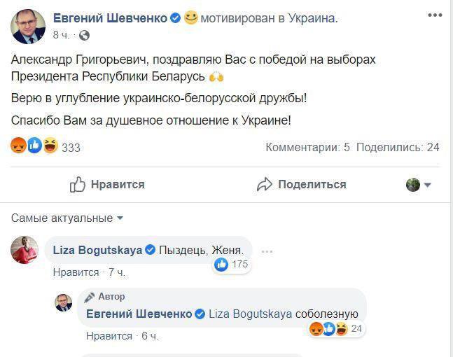 11:46 Нардеп от "Слуги народа" Евгений Шевченко поздравил Александра Лукашенко с победой на выборах.