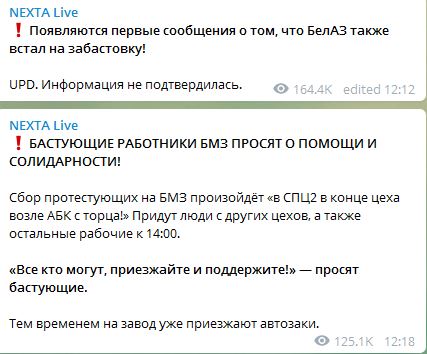 12:24 Телеграм-канал NEXTA сообщил, что Белорусский металлургический завод начал забастовку. Правда, позже уточнил, что информация не подтвердилась. Однако якобы рабочие планируют ее провести к 14:00.