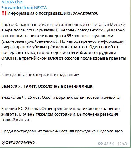 2. В Минске ночью силовики сумели рассеять протестующих и взять ситуацию под контроль, действуя крайне жесткими методами. Много людей избиты. По официально неподтвержденным данным есть и погибший.