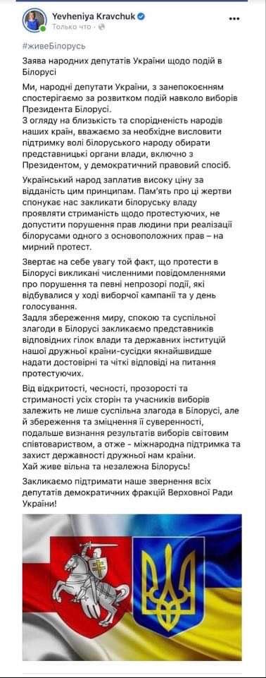 9:45 Заместитель главы фракции "Слуга народа" Евгения Кравчук выступила с заявлением о событиях в Беларуси, в котором призвала представителей власти к диалогу с протестующими. В этом мессендже более акцентировано "антилукашенковское".