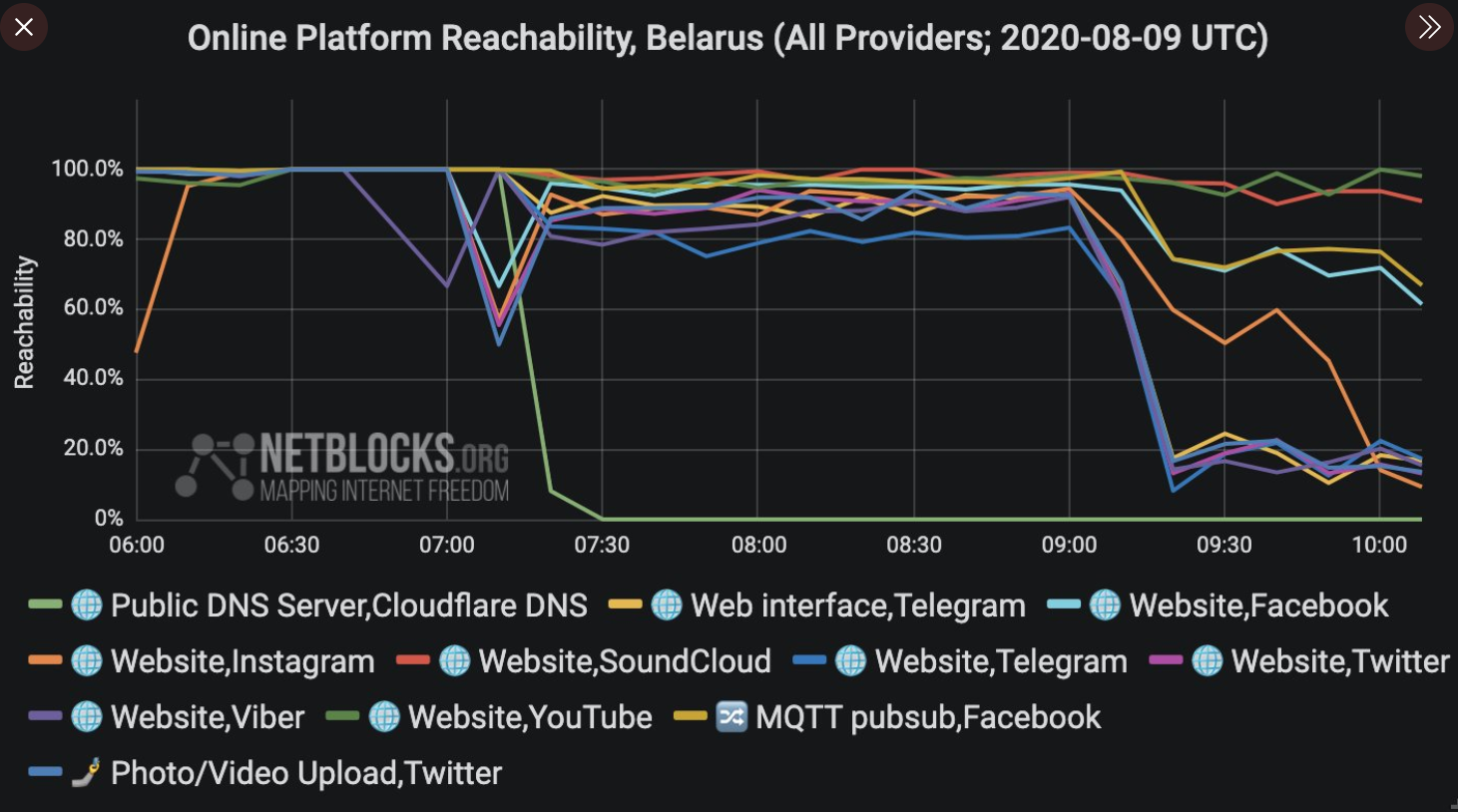 09:57 СМИ, поддерживающие оппозицию, пишут о проблемах с интернетом в Беларуси. Все очень медленно грузится без VPN - очень сложно отправлять фото и видео. А у провайдера А1 в Минске вообще все отключилось.