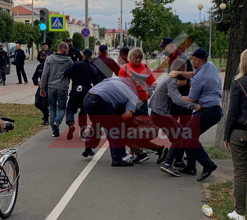 Еще около 500 человек собрались на площади у цирка. Когда они шли к площади Ленина колонной под бело-красными флагами, подъехали военные грузовики. Силовики начали разгонять и задерживать участников протеста.