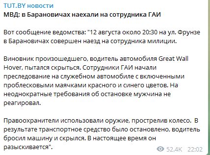 "Сегодня, 12 августа, около 20.00 на пересечении ул. Мельникайте и пр-та Победителей в Минске 45-летний мужчина за рулем "Шкоды" совершил наезд на сотрудника ГАИ. Водитель попытался скрыться с места происшествия, но вскоре был задержан. Для остановки транспортного средства сотрудники Госавтоинспекции использовали табельное оружие. Сотруднику милиции оказана медицинская помощь, он доставлен в медучреждение" - сообщили в ГУМВД Минска.