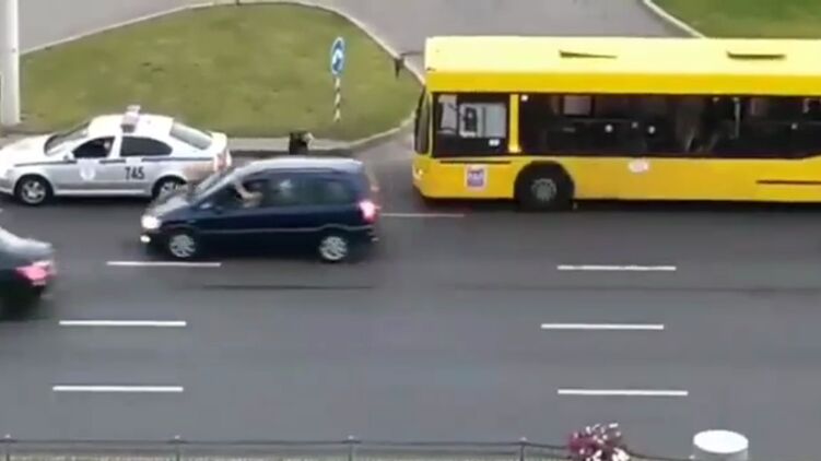 На ролике запечатлен момент, как сотрудник милиции стоит у обочины и бьет дубинкой по проезжающим машинам. Одной из них снесли боковое зеркало, и владелец авто - пожилой мужчина - остановился. Когда он вышел, его впятером схватили ОМОНовцы и затащили в стоящий у дороги автобус.