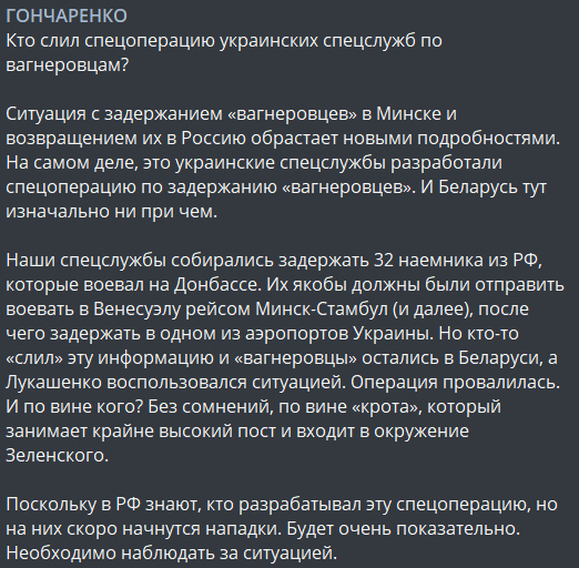 Телеграм-канал "Политика Страны" отмечает, что версия о "сливе из Киева" почти полностью повторяет версию, которая появилась в российских СМИ еще до выборов в республике, о том, как украинские службы заманивали "вагнеровцев" в Минск. И появилась украинская интерпретация этой версии, что важно, уже после публикаций в российских СМИ (то есть ее авторы могли оттуда и черпать информацию, придумав к ней затем некоторые детали).