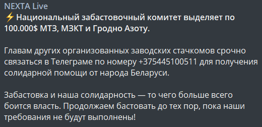 При этом, судя по сообщению оппозиционного Телеграм-канала Nexta live, бастующим рабочим обещают выделить по 100 тысяч долларов на завод "от народа Беларуси" - чтобы не боялись невыплат зарплат во время простоя.