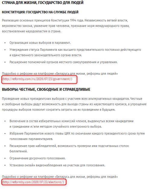 Более того, в белорусских СМИ ранее публиковалась еще более полная версия программы кандидата. И каждый ее пункт содержал ссылку на данный сайт.