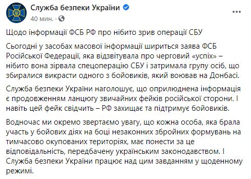 "Сегодня в средствах массовой информации распространяется заявление ФСБ Российской Федерации, которая отчиталась об очередном "успехе" - якобы она сорвала спецоперацию СБУ и задержала группу лиц, которые собирались похитить одного из боевиков, который воевал на Донбассе.