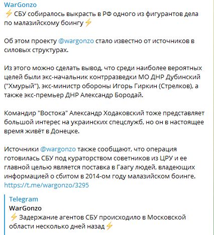 Близкий к российским силовикам Телеграм-канал WarGonzo, ссылаясь на источник, пишет, что СБУ собиралась выкрасть одного из фигурантов дела по малайзийскому боингу.