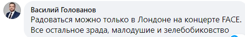 "Радоваться можно только в Лондоне на концерте FACE. Все остальное зрада, малодушие и зелебобиковство", -  журналист Василий Голованов намекнул на сына Порошенко, который в британской столице посещает вечеринки с русскими рэперами.