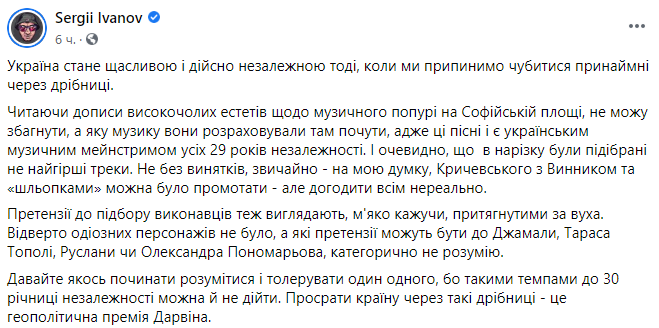 Блогер Сергей Иванов, известный в прошлом своей националистической позицией, в последнее время сотрудничает с Офисом президента. И позиция по концерту у него соответствующая.