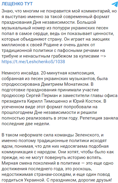 "Знаю, что многим не понравится мой комментарий, но я выступаю именно за такой современный формат празднования Дня независимости. Большой музыкальный номер из попурри украинских песен попал в самое сердце, ведь он показывает ценности, которые объединяют страну. Он играет на эмоциях миллионов к своей Родине и очень далек от традиционной политики с пафосными речами на трибуне и ненасытным грабежом за кулисами.