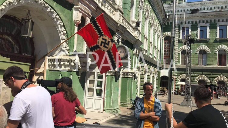 Для съемок развесили флаги со свастикой. Фото: Страна