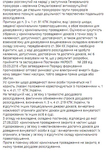 "В ходе досудебного расследования не получено надлежащих, допустимых, достоверных и достаточных доказательств, беспрекословно указывающих на то, что в результате разработки, принятия и применения Постановления НКРЕКП № 289 от 03.03.2016 "Об утверждении Порядка формирования прогнозируемой оптовой рыночной цены электрической энергии" были нанесены тяжкие последствия, то есть нанесенный прямой вред или ущерб" - говорится в сообщении САП.
