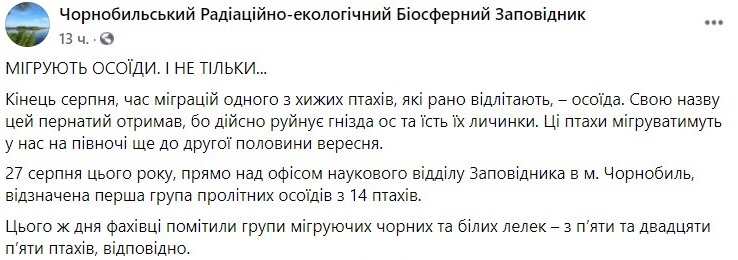 Опубликованы фото осоедов и аистов, которые покидают зону отчуждения Чернобыльской АЭС. Фото