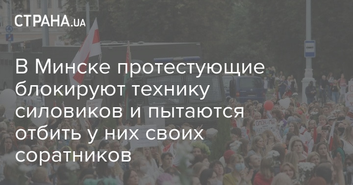 В Минске, где в эти минуты проходит массовая акция протеста против президента Беларуси Александра Лукашенко, митингующие блокируют передвижение техники силовиков. Демонстранты активно пытаются отбить у правоохранителей своих соратников, задержанных у здания КГБ.