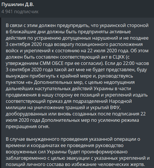 "Особое внимание вызывают позиционные нарушения ВФУ (вооруженных формирований Украины - Ред.) в районе населенного пункта Шумы (Торецкий район - Ред.), где противник продвигает свои укрепления (траншеи) к арке водовода "Северский Донец – Донбасс" с явным намерением укрепиться под ней, а также на пилотном участке разведения в районе Петровского, где СММ ОБСЕ фиксирует оборудованное после вступления в силу дополнительных мер новое укрытие на бывшей позиции вооруженных формирований Украины", - заявил Пушилин.