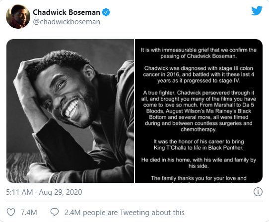 В субботу, 29 августа, в официальном аккаунте американского актера Чедвика Боузмана было опубликовано сообщение о его смерти. Всего за три дня твит набрал более 7,3 млн лайков и 3 млн ретвитов.