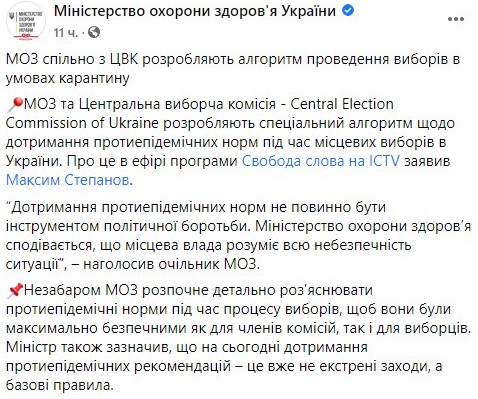 В МОЗ Украины начали разрабатывать алгоритм проведения выборов на карантине