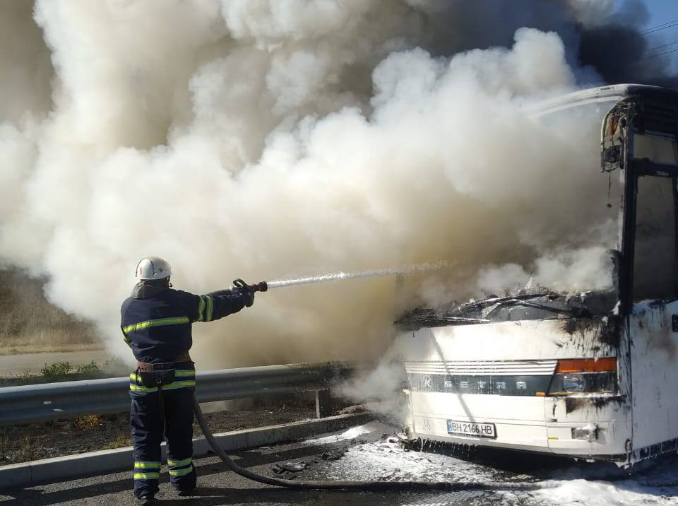 "1 сентября в 15:25 в оперативно-диспетчерскую службу Ставищенского района поступило сообщение о возгорании автобуса "СЕТРА" на трассе Киев - Одесса вблизи села Снежки", - говорится в сообщении.
