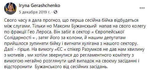 "Он (Бужанский. – Ред.) забежал в сектор "Европейской солидарности", затащил его (Лероса. – Ред.) за колонны, и нашим депутатам пришлось останавливать драку", – написала Ирина Геращенко в "Фейсбуке".