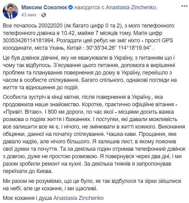 Так, в воскресенье, 6 сентября, руководитель Госмиграционной службы опубликовал в своем Фейсбуке пост, посвященный знакомству с Анастасией Зинченко. По словам Соколюка, все началось с его звонка девушке, которая на тот момент не могла эвакуироваться из Уханя.