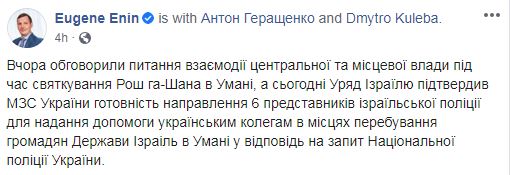 "Вчера обсудили вопросы взаимодействия центральной и местной власти во время празднования Рош ха-Шана в Умани, а сегодня правительство Израиля подтвердило МИД Украины готовность направления 6 представителей израильской полиции для оказания помощи украинским коллегам в местах пребывания граждан государства Израиль в Умани в ответ на запрос Национальной полиции Украины", - написал Енин.