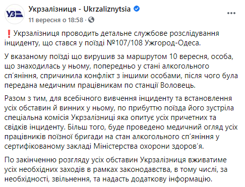 "В указанном поезде, который отправился по маршруту 10 сентября, лицо, которое находилось в нем, предварительно в состоянии алкогольного опьянения, спровоцировало конфликт с другими лицами, после чего было передано медицинским работникам на станции Воловец", - заявили в пресс-службе "Укрзализныци".