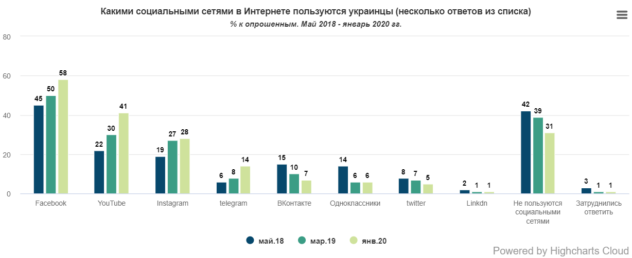 С 2018 по 2020 годы популярность ВК упала с 15% до 7%, а Facebook вырос с 45% до 58%. Таковы результаты опроса компании R & B Group. Также еще 6% пользуются запрещенными "Одноклассниками". То есть как минимум 13% населения используют российские соцсети и не боятся об этом говорить.