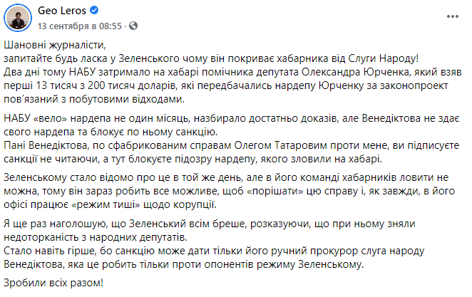 Информацию о взятке 13 сентября опубликовал нардеп Гео Лерос, которого недавно исключили из фракции "Слуга народа".