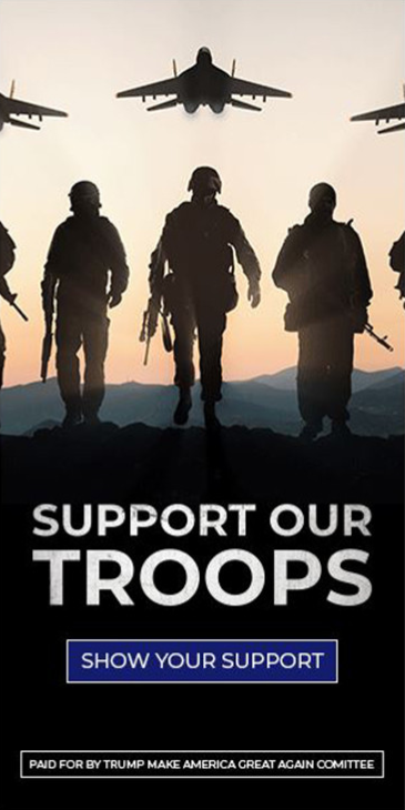 Уточняется, что в рекламе от кампании Трампа "Вернем Америке былое величие" фигурируют силуэты трех солдат, над которыми пролетает истребитель.